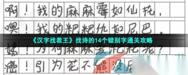 找出错别字是汉字找茬王游戏中的一个关卡玩法,我们需要找出对应的汉字即可顺利过关了,在找诗的14个错别字中,需要找到14个错别字即可顺利过关了,那么这一关要怎么过呢?接下来233乐园小编就给大家整理了关于《汉字找茬王》找诗的14个错别字通关攻略全部内容,感兴趣的小伙伴继续往下看看吧。 《汉字找茬王》全关卡通关流程汇总攻略:点击查看