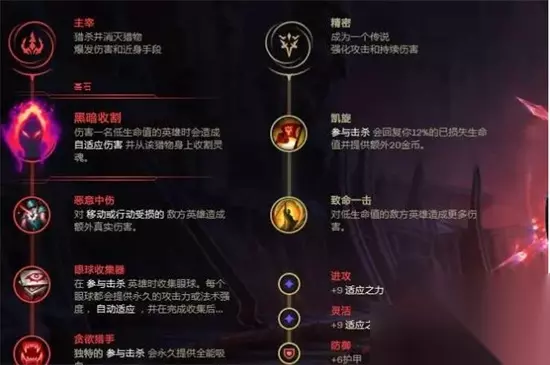 螳螂基石符文首选黑暗收割,作为一个偏收割向的打野刺客,能刷新的黑暗收割最适合螳螂。 主系小符文推荐点出恶意中伤、眼球收集器与贪欲猎手,虽然螳螂的E可以触发猛然冲击,但是螳螂的E技能CD长,且作为唯一的位移,前期通常用来收尾使用,猛然冲击性价比有限,而螳螂的被动平A能够减速敌人,可以触发恶意中伤,实战中恶意中伤更加实用。 贪欲猎手则是螳螂Q作为单体伤害可以享受到全额全能吸血效果,贪欲猎手能够很好地提升螳螂的续航能力。 副系则推荐选择精密系的凯旋与致命一击最大化滚雪球能力。