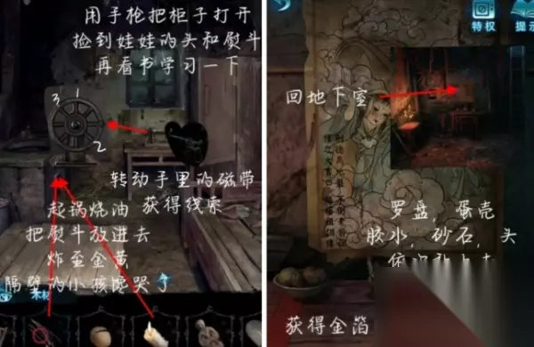 13、使用铁丝将柜子打开获得熨斗和布娃娃,右侧书点一下获得线索,使用剪刀将布娃娃头部剪掉。 14、到地下室点击桌子,将圆盘和蛋壳放上去,胶水、砂石、娃娃头放进蛋壳获得不倒翁,左侧书籍获取金箔。