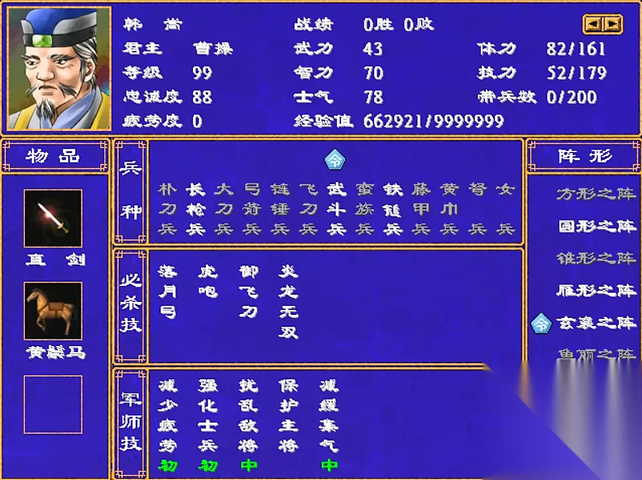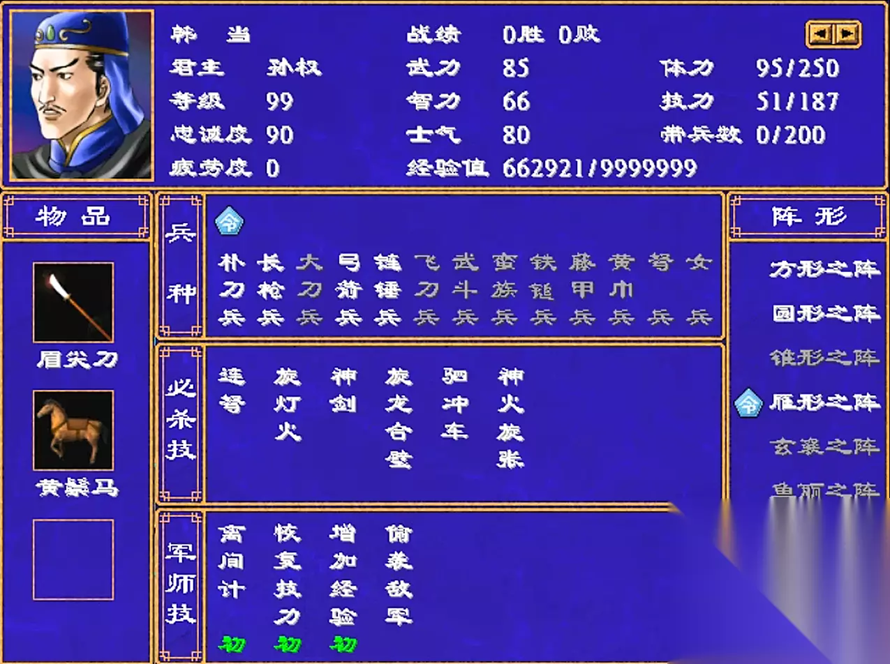 韩当武力82,智力66 武将技6个:1级的连弩,7级的旋灯火,15级的神剑,21级的旋龙合璧,27级的驷冲车,34级的神火旋张 军师技4个:1级的离间计(初),10级的恢复技力(初),20级的增加经验(初),28级的偷袭敌军 韩当应该是这个姓氏中最猛的了,武将技还是非常顶的。