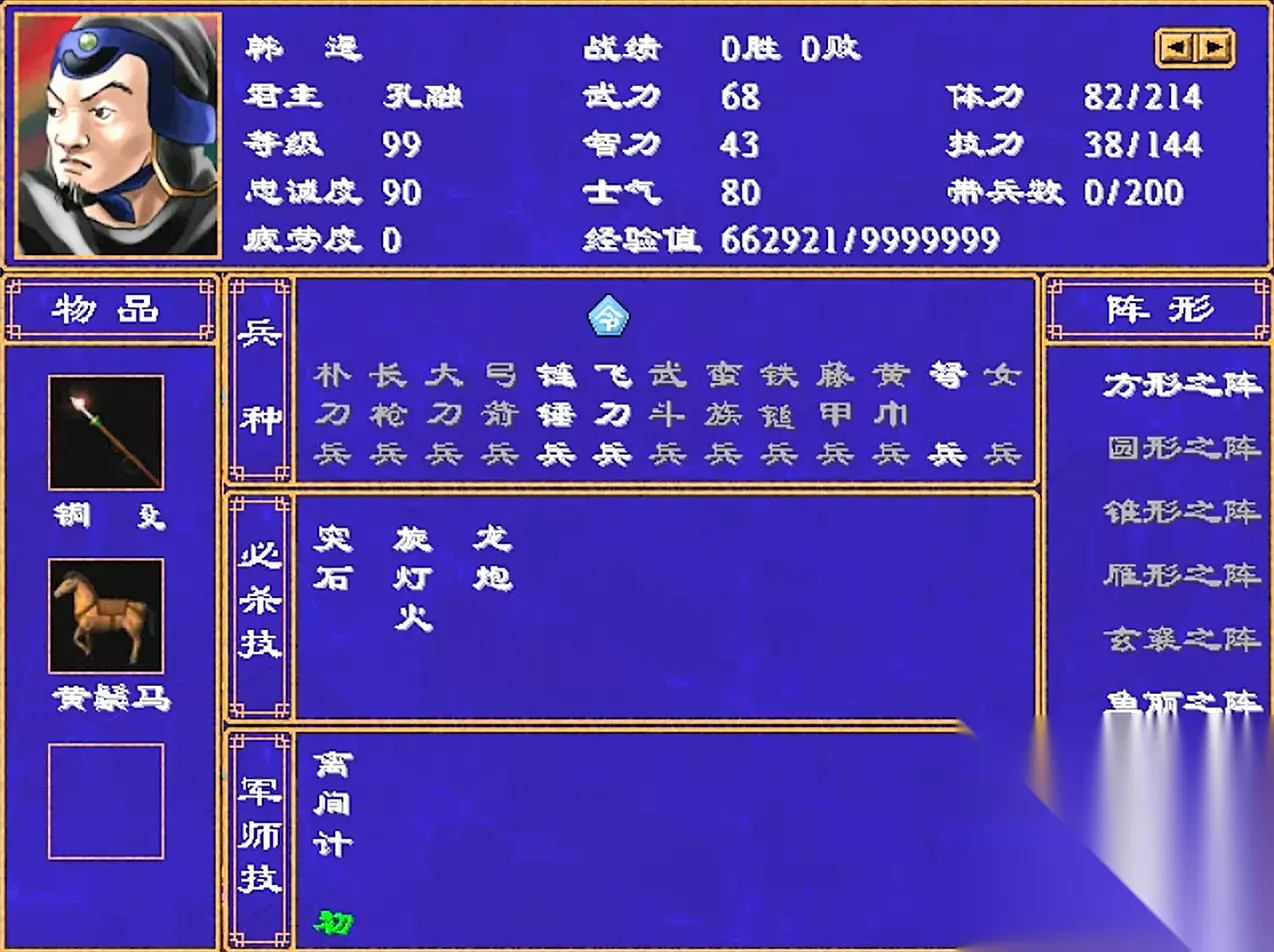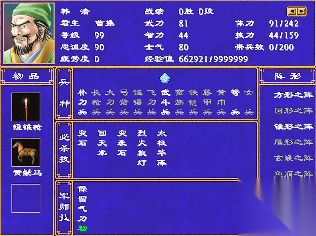 韩浩武力79,智力44 武将技5个:1级的突石,8级的回天术,16级的突袭石,23级的烈火旋灯,31级的太极华阵 军师技1个:1级的保留气力(初) 烈灯还是不错的,打打一般将领那是绰绰有余,但前提是升到23级。
