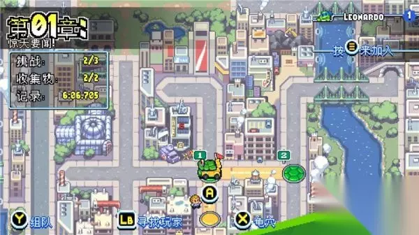小地图画面(选关画面) 采取了经典的《忍者神龟》1代的平面关卡设计,你可以进行自由选关,查看关卡的挑战和收集完成度。