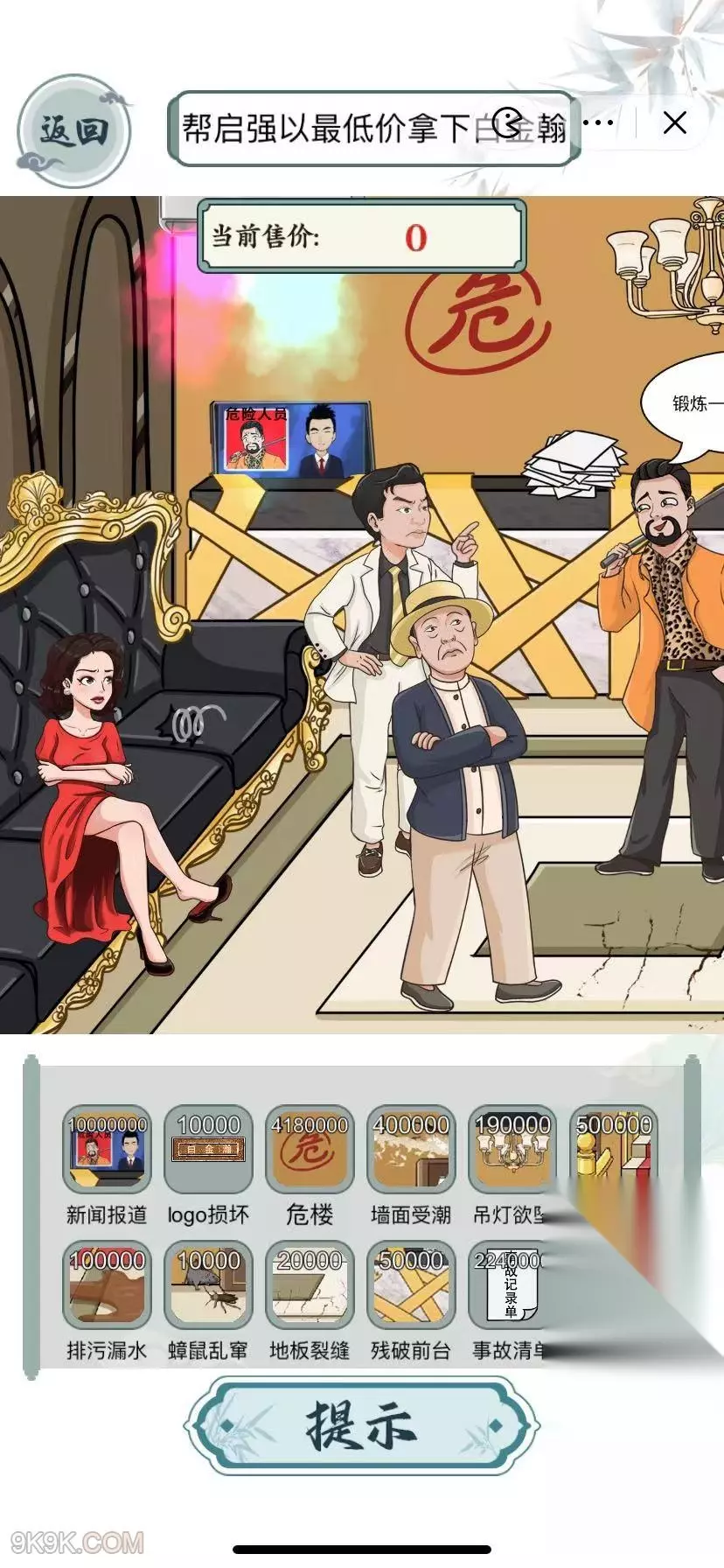 文字玩出花拿下白金瀚怎么过?帮启强以最低价拿下白金翰要注意什么呢?下面小编为大家带来文字玩出花拿下白金瀚通关攻略,一起看看吧。 帮启强以最低价拿下白金翰分别是: 1.右滑前台的电脑,电脑屏幕转过来,点击电脑屏幕。 2.点击白金瀚广告牌 3.点击完广告牌后,右滑广告牌,然后点击墙上的危字。 4.点击受潮的墙面 5.点击摇晃的吊灯 6.点击黄金楼梯损坏的部分 7.点击地面的污水 8.点击墙角的老鼠 9.点击地板的裂缝 10.点击桌子上厚厚的事故单 11.点击用胶带粘住的前台 12.把强哥拖到沙发上,露出弹簧,点击弹簧