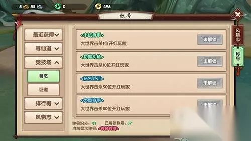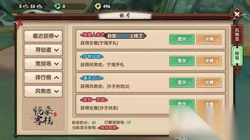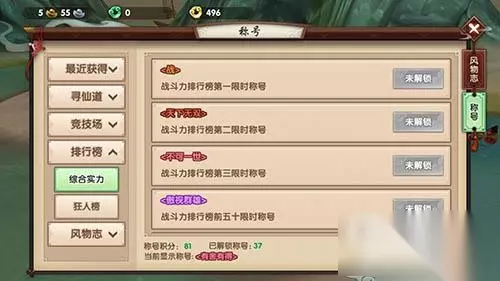 排行榜称号获取技巧: 排行榜称号是仙友们综合战力含金量最高的称号了!无论在综合实力还是在狂人榜有一席之地的仙友就能够获得对应的含金量称号,但是由于排行榜都是不断浮动的,所以称号都有限时的特点。比如,仙友们获得战斗力排行榜第一时,可以自动获得‘战’的限时称号。 排行榜的综合实力称号由战斗力、财富、重伤、强化称号构成,而狂人榜称号则由武疯子、觅金徒等称号构成。要想在寻仙界扬名立万那么各种排行榜就是你关注和争夺的重点,所以只要努力增强自己的实力排行榜称号就会自动来!排行榜称号只是仙友们排行的附属物哦! 风物称号获取技巧: