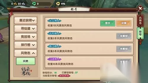 风物志称号只有风物称号一种,它需要仙友们成本成本的收集齐对应的风物志后才能够获得,它可以和珍藏类称号同时进行。比如要获得‘出尘散人’称号就需要仙友收集齐一本风景类风物志。 风景类风物志的获取并不简单,除了小桑村的几个仅有的风景可以以完成主线任务的方式获得外,其它风景类风物志的获得要更看脸一些,要依靠几率的世界掉落才能拥有!难度还是颇大的,不过也有一些特殊的风景类风物志也可以在镇妖商店里用镇妖塔声望来购买,比如秋风落叶就可以花费1000镇妖塔声望来获得。