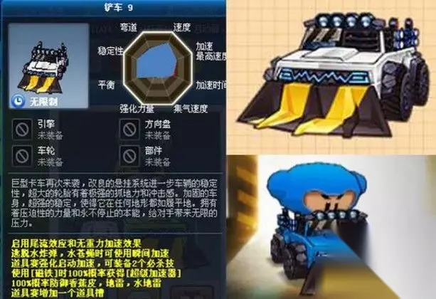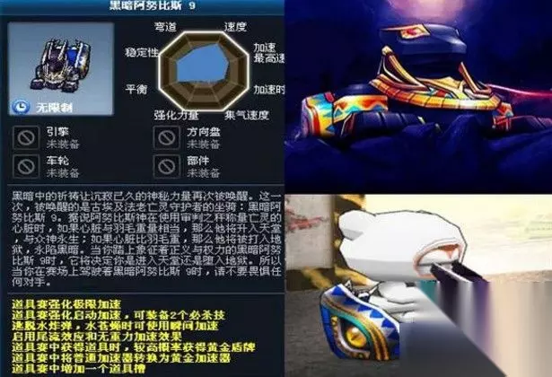 第七名:黑暗阿努比斯/阿努比斯9 不要以为盾车没有攻击力,于是弱。俗话说:最好的进攻就是防守。你再多攻击,打人家不痛,那作用还是零。 任何赛制,任何规则,都有盾车的一席之地,它最大的作用不是领跑,而是充当肉墙,盾车最强大的时候是当它跑第二名时,为前面的队友挡住枪林箭雨,一夫当关,万夫莫开。 道具赛较量的核心不是你打了敌人多少下,更重要的是能不能保住自己的位置,比如保住2到4,然后再想办法牵制和拖慢敌人,老是掉队就什么用也没有了,盾车强就强在它的卡位能力,顺便也能用一些小炸弹小蚊子小水球之类的道具来牵制敌人,防守上的完全优势,令它始终能守住比较靠前的位置,堪称移动要塞。 阿努比斯拥有最高概率的金盾,正因为得率高,所以更容易卡住上游位置,因为卡住上游,所以得到更多的金盾,这是一种良性循环,最后算下来,金盾的获得量足足是天马的一整倍,当之无愧的盾车之王。 有这样一个盾车在前面,糖果和骷髅往往会感到即无力又无赖,导弹扔出去,水花都看不见一滴,而自己却还要面临前面扔出的水地雷,简直天克。 第六名:铲车9