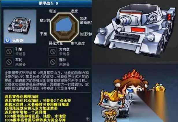 第八名:钢甲战车9 我本以为氪金玩家只存在于少数人当中,自从玩了这个游戏,发现氪金是一个全民性质的群体,哪都能遇见三红改装,哪都能遇见水地雷,你们的粒子难道是冲话费送的吗? 水地雷是特别恶心的一个道具,除了一变二,更厉害的是群攻,不是怕不怕,而是躲不了,跟技术没有关系,人家会在特别狭小的路段,或者在后面看不见的死角扔上两个,即使你小心翼翼,你不踩别人也会踩,不可能避免。 而钢甲战车很好地诠释了什么叫适者生存,就一个无视水地雷,足以令它的地位举足轻重,在主流比赛当中,几乎把把都有大量的水地雷,相比糖果和骷髅,老是上来又下去,下去又上来,钢甲战车更不容易掉队,它能在中,上游的位置呆更久,只有跑中,上游,才能得到金炸,才能发挥掩护的作用。 有人说,总感觉钢甲战车的金炸得率比别的掩护车高,其实不是概率高,而是你跑中上游的时候比别车多,所以吃到金炸才多。