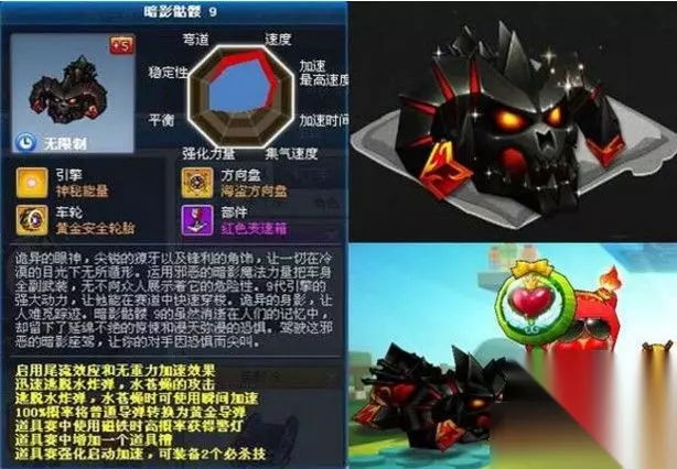 第九名:暗影骷髅9 与圣诞糖果不同的是,冰水换成了“磁铁高概率得警灯”,大概百分之40左右,鉴于冰水的效果并不比普通水好多少,而暗影骷髅的磁铁额外获得警灯,既可以攻击,又加强后追,虽然是个概率,但仍然要比冰水强一点。所以排名比糖果高。 实战中没有防守的车经常被人一两个道具就打到后面去了,这种情况如果不赶快上位的话,落后是捡不到导弹和冰水的,那就只能跟在队伍后面捡磁铁和加速玩,好在暗影骷髅的磁铁能得警灯,除了增加上位能力,顺便还能转一下敌人。 缺点:警灯概率偏低,存在大的不确定性,发挥不稳。 优势:中游能得到金炸,下游能得到警灯,两段兼顾,全方位掩护。 总结:金炸和警灯能上能下,是天造地设的黄金组合,只可惜暗影骷髅的警灯概率偏低,时而欧洲教皇,时而非洲黑酋,发挥不稳定,所以潜力有限。 无规则不是很强,但是天然属性就能打中游和下游,也推荐玩无改赛。