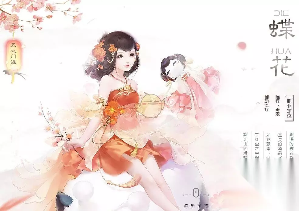 五大职业技能:蝶花|少林|影月|玄冰|蜀山 《花与剑》蝶花职业及技能搭配推荐 蝶花介绍 蝶花游戏中唯一的奶妈,可以救死扶伤,同时可以隐身穿梭在战场让敌人找不到位置,身轻体盈易推倒,喜欢治疗辅助必玩的角色。 治疗能力强大,能将单体和全队多个单位的生命值恢复治疗,还能驱散控制效果,是一个非常重要的辅助职业,特别是多人竞技PK和副本中,非常厉害。 职业定位 远程、毒系、辅助治疗 职业技能 1.普通攻击: 连续对前方敌人进行四次普通攻击; 2.花飞蝶舞: 撩起身边花瓣,攻击前方和周围的敌人,造成89%法术强度的毒伤害; 3.熊猫圆圆: 能召唤出熊猫圆圆协助进行战斗,圆圆能保护主人,将敌人的视线转移; 4.天香续命: 能复活一个阵亡的队友,并恢复期460%的法术强度的生命; 5.月裳幻隐: 能使自己隐身一段时间,隐身时无敌,移动速度增加,但是不能释放任何技能,释放时会有概率净化自己及周围队友; 6.天蚕柔丝: 使用天蚕柔丝链接自己与所有队友,使全部人受到的伤害均衡。天蚕柔丝承受1580.0%法术强度的伤害后断裂; 7.樱语浅吟: 能对身边的队友进行治疗,每次恢复380%法术强度的生命; 8.凝香若嫣: 治疗单体队友,恢复280%法术强度的生命,并有76.0%几率净化该队友; 9.旖旎随风: 治疗单体队友,恢复其600%法术强度的生命并获得持续回血效果; 技能搭配推荐 1、PK竞技: 月裳幻隐、天蚕柔丝、天香续命、樱语浅吟 在多人PK副本中非常厉害,恢复力量强大。 2、治疗恢复: 天香续命、凝香若嫣、樱语浅吟、旖旎随风 单体恢复和复活能力非常强大,在副本中是一个绝佳配置;