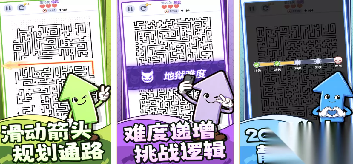 融合物理运动模型与三消规则,突破传统静态网格限制。所有箭头具备自主位移能力,依据自身朝向沿路径高速行进。玩家通过旋转或落点调整,促成同轴反向箭头精准对撞,触发连锁爆炸消除。每次消除均可能重置邻近箭头方向,对连击路径预判精度提出严苛要求。反馈音效清脆利落,消除过程宛如精密触发的多米诺系统。 高速下载 普通下载 优先233乐园APP下载 3、《箭头》