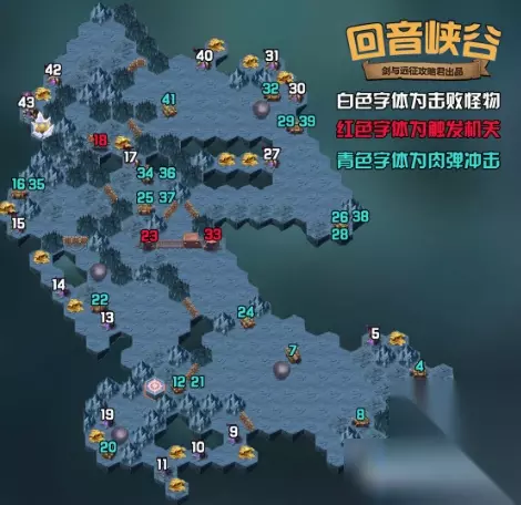 《剑与远征》回音峡谷机关顺序 这次新奇境副本的地图很大,依旧是机关+路线的方式,需要点击开关的顺序和位置都在图中有所标志。 这次副本难度不大,一路平推即可,难点在路线方面。 先把1-5的怪清掉拿遗物,然后按照顺序触发机关打开路线,具体顺序看图就好。