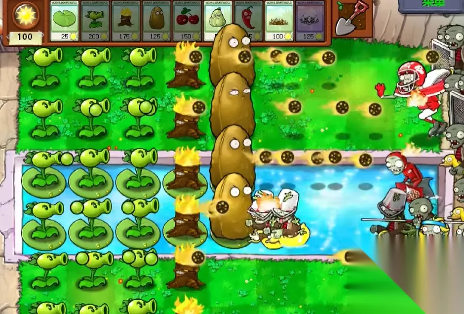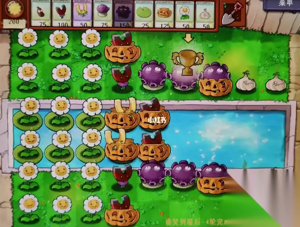 该关卡禁用向日葵等产阳光植物,因此阳光管理成为核心。推荐优先选择地刺、忧郁菇、火炬树桩等高性价比植物。地刺能持续输出且成本低,适合铺满前排;忧郁菇配合大蒜可改变僵尸路径,集中火力输出;火炬树桩能强化豌豆类植物攻击。水路需用荷叶搭配攻击植物,同时注意补充南瓜头保护关键植物。