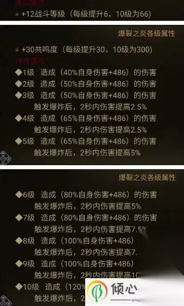 爆裂之炎10级的爆炸伤害是120%自身伤害+486,是一个范围AOE伤害,冷却时间6秒,最重要的是爆炸后在2秒内有增伤效果,满级的爆炸之炎可增伤10%! 二、爆裂之炎伤害分解