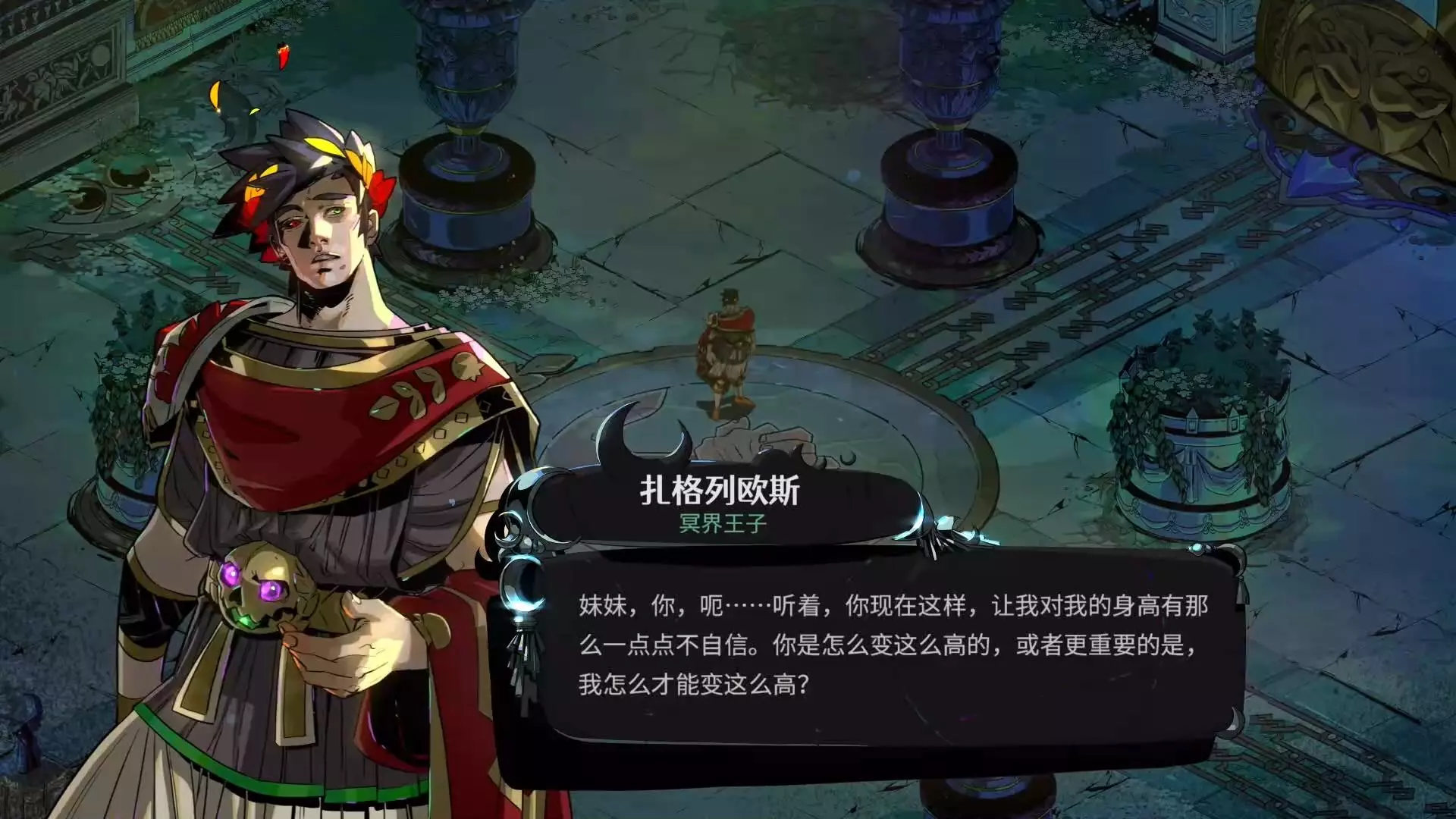 这是独立游戏《Hades》的相关内容,展示了主角扎格列欧斯与塔纳托斯等角色的互动对话,呈现了游戏里全25名角色按信物柜顺序的不解之缘相关内容,展现角色间的羁绊。