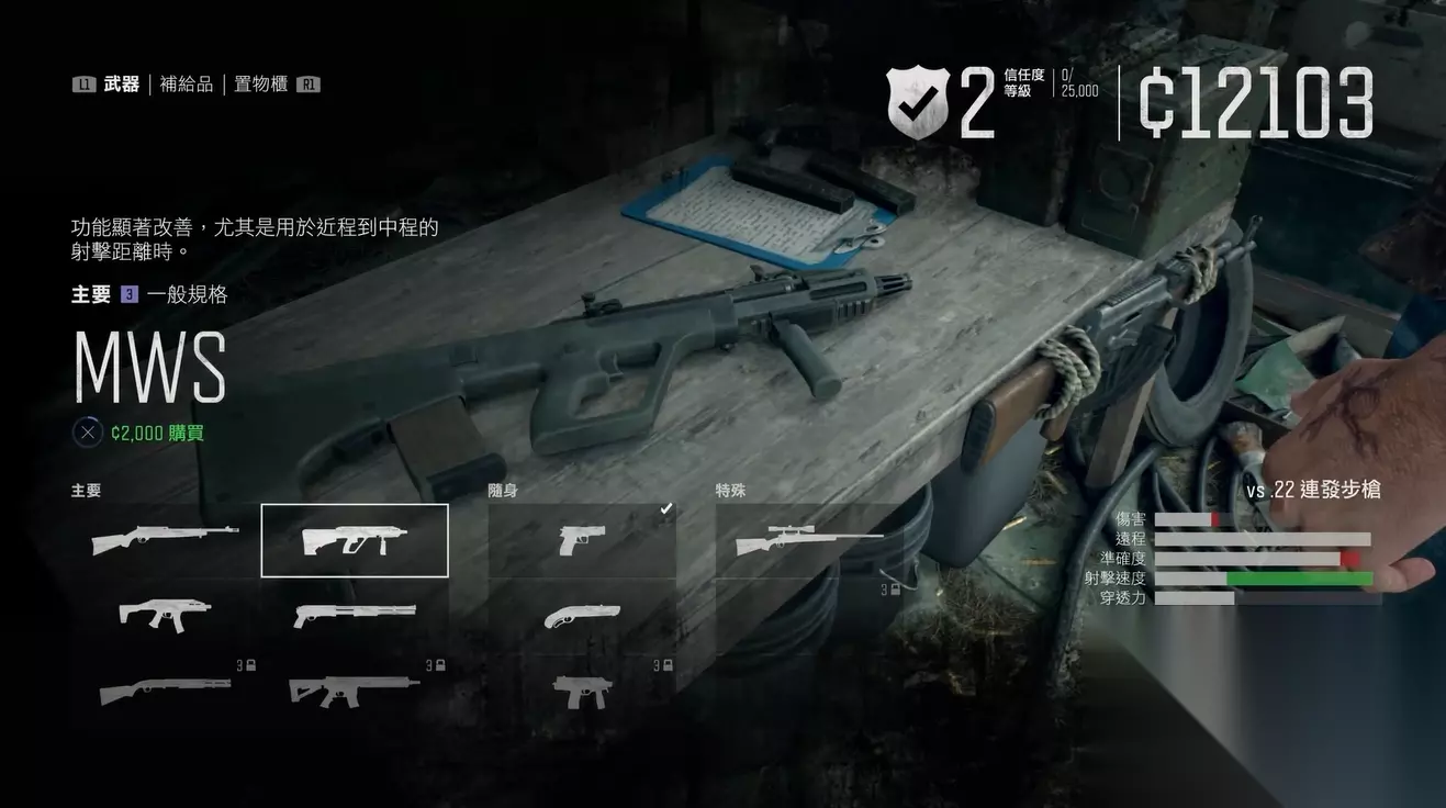 开局神器:二二连发步枪的妙用 作为新手,你的第一把得力武器非二二连发步枪莫属!这把枪的获取方式超级简单——在埋伏营会遇到一个神秘NPC,完成他交给你的小任务后,他就会大方地把二二连发步枪丢在地上,直接捡起来就行!这把枪就像你的启蒙老师,伤害稳定、操作顺手,能帮你轻松应对前期的各种小怪。万一你手滑没捡到或者不小心弄丢了,也别慌,后续在商店里就能轻松买到,价格亲民,绝对是前期过渡的不二之选。 但记住,二二连发步枪只是起点,不是终点。它的主要任务就是帮你攒够资源,顺利过渡到更强大的武器。记住这个小技巧:前期节省子弹,多利用这把枪的连发特性清理零散敌人,这样你就能更快地积累经验值和金币。等到你买到MWS步枪后,就可以毫不犹豫地换掉它,因为MWS才是真正的主武器明星!