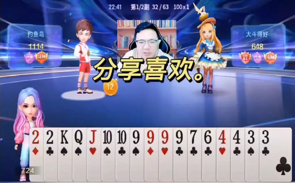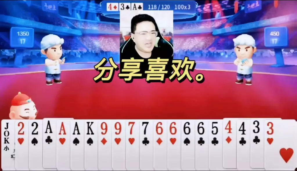 三岁玩牌破釜沉舟四个3的大胆一炸后期残局细腻的行牌为自己争取到了胜利!