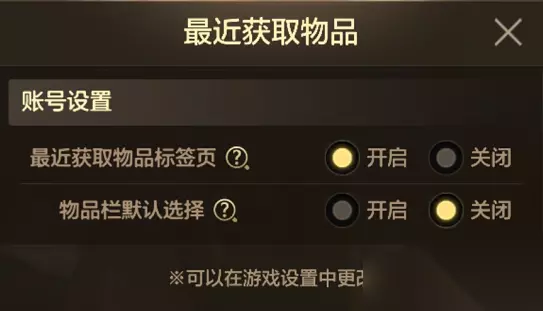 关闭后想要再次开启时,可以通过游戏设置>选项>账号设置>最近获取物品标签页,开启该功能。