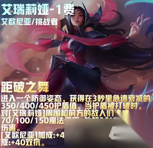 艾瑞莉亚技能就是距破之舞主要就是在进入一个防御的姿态之中后获得上一定的护盾值,在护盾被打破之后能对前方的敌人造成一定值的魔法伤害,还会有额外的伤害加成。 云顶之弈s9艾瑞莉亚技能介绍 技能介绍 距破之舞 刀妹是比较正常的坦克,但是在9艾欧尼亚中可就变得不一般了。