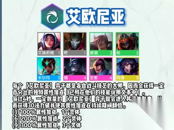 羁绊介绍 艾欧尼亚(3/6/9) 每个[艾欧尼亚]弈子的技能里都有一个独特加成。 每4秒,你的最强大的[艾欧尼亚]弈子们会显现成他们的灵体状态,从而获得20潜力值和双倍属性加成,持续4秒。 (3) 100%[艾欧尼亚]加成,显现1个灵体 (6) 200%[艾欧尼亚]加成,显现2个灵体 (9) 300%[艾欧尼亚]加成,显现3个灵体