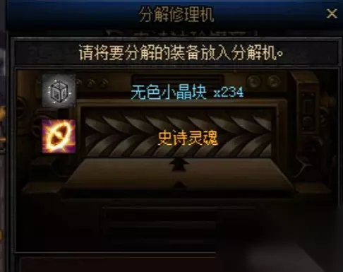 第二个是装备分解,大家都知道 副职业的神级分解机 分解装备出的无色 会比系统的分解机更多 但是 分解史诗装备的 时候 分解的无色数量是一样的 不信给你们做一个实验对比,我现在用两个相同的史诗 首先测试系统的分解机,是234个无色晶块