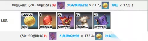 6、80级:120000摩拉、燃愿玛瑙6个、常燃火种20个、慕风蘑菇60个、禁咒绘卷24个。