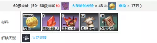 4、60级:80000摩拉、燃愿玛瑙块3个、常燃火种8个、慕风蘑菇30个、封魔绘卷18个。