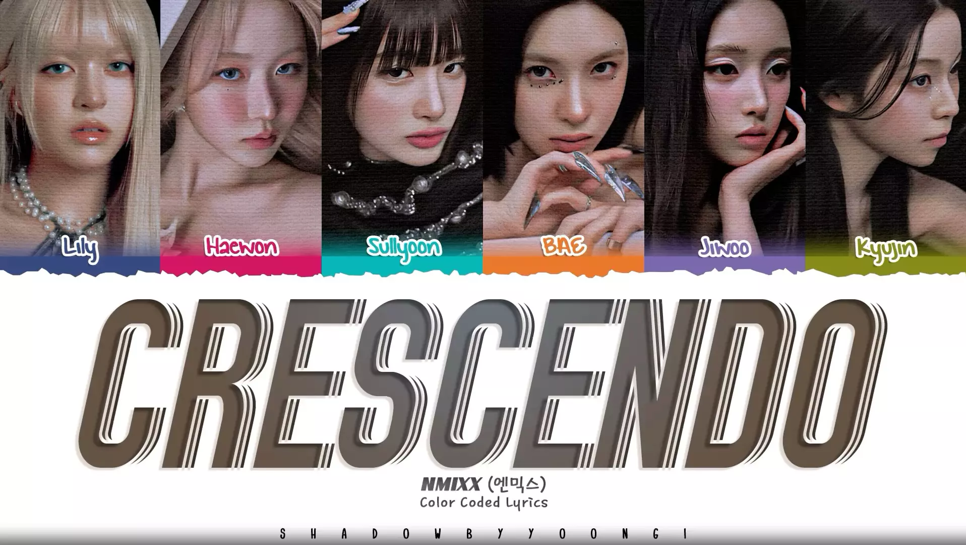 这是韩国女团NMIXX歌曲《Crescendo》的歌词分配内容,展示了Lily、Haewon等成员对应的歌词段落,包含韩文原文、罗马音及英文翻译,清晰呈现各成员的演唱部分。