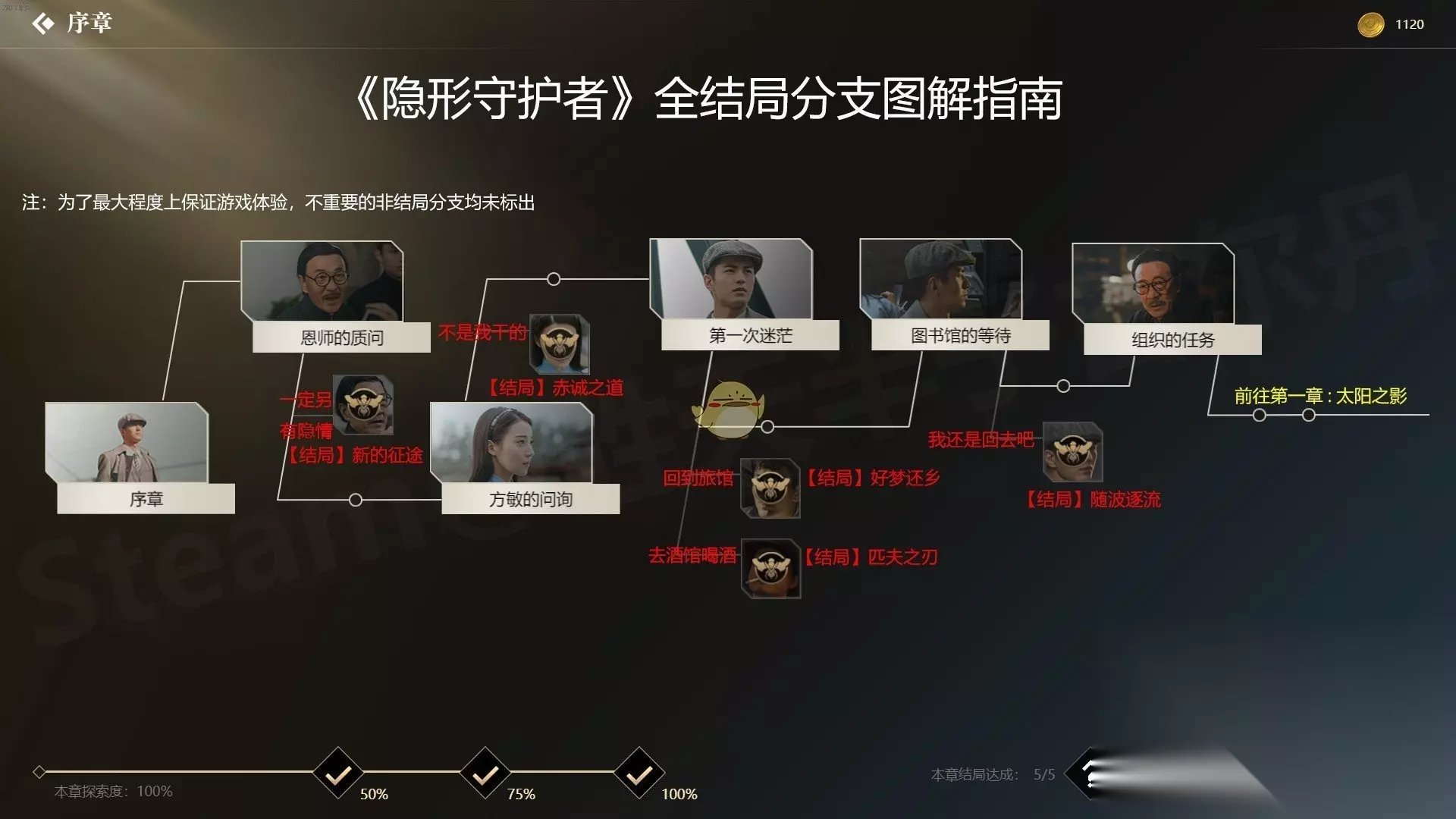《隐形守护者》是一款文字冒险游戏,玩家将体验那个战火纷飞的年代中的传奇谍战故事,游戏中根据玩家的选择会导向不同的结局,100%探索度需要解锁全部的结局,下面小编就为大家带来一篇“胜天半子古尔丹”分享的全剧情分支一览及全结局100%探索度达成攻略。