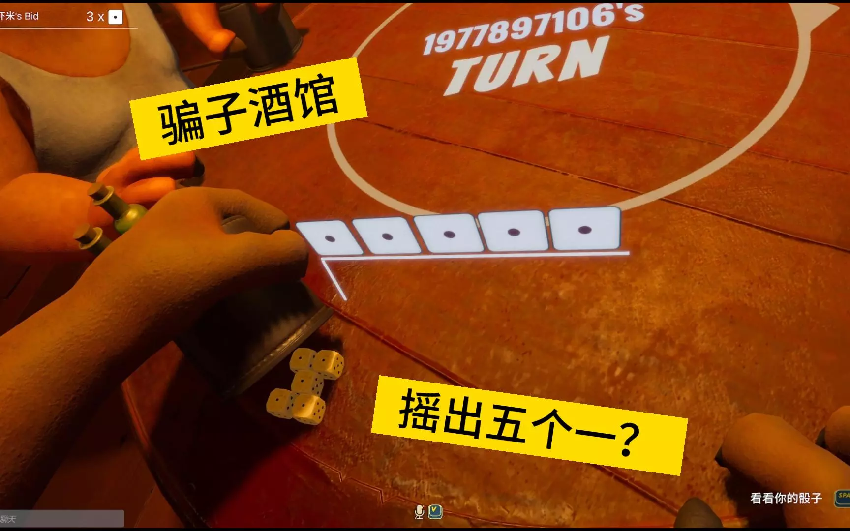 这是主机游戏《骗子酒馆》的趣味对局画面,对局中玩家开骰后看到点数结果十分无奈,面对其他玩家的质疑,玩家看点数后对自己的发言认怂,对局过程充满欢乐趣味性。