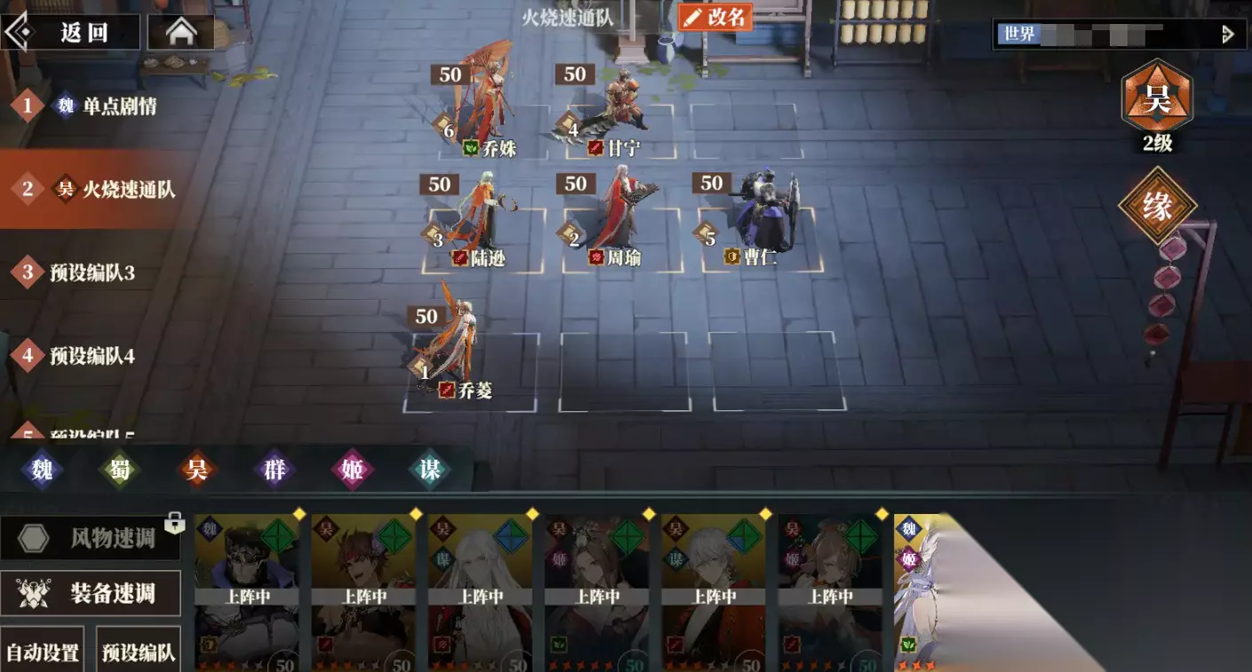 大部分关卡即使只用一套基础阵容也能获得奖励,不会过度依赖单一最强阵容,提升角色战力不只是升级,还需为角色配备武器装备、套装、风物才能显著提升战力。单个武将养成毕业所需资源较多,但整体而言是较为平滑的,并且资源获取途径也多。