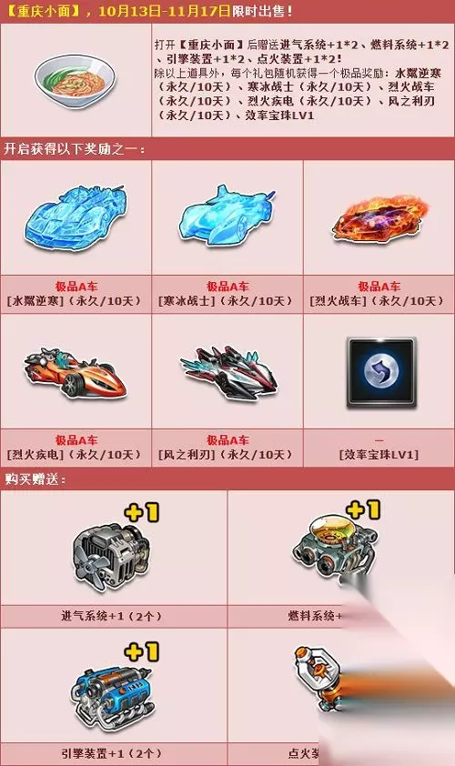 《QQ飞车》【重庆小面】10月13日-11月17日限时出售,仅需3.9元/个!开启概率获得永久极品A车。各位车手心动了吗?那就赶紧进来看看都有什么奖励在等待着大家吧。 【重庆小面】10月13日-11月17日限时出售,仅需3.9元/个!购买赠送进气系统+1*2、燃料系统+1*2、引擎装置+1*2、点火装置+1*2!开启概率获得极品A车:水粼逆寒(永久/10天)、寒冰战士(永久/10天)、烈火战车(永久/10天)、烈火疾电(永久/10天)、风之利刃(永久/10天)、效率宝珠LV1,已拥有的永久极品奖励不会重复获得。