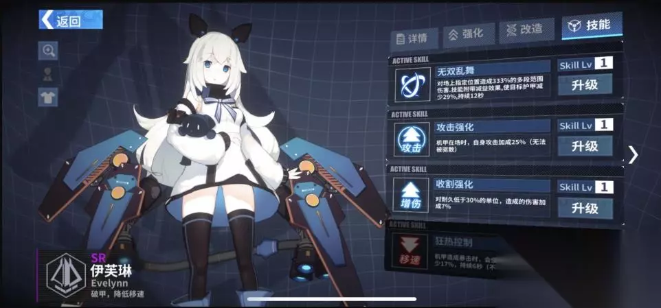 SR伊芙琳 T1 格斗 10%暴率/突击专精 10%闪避/轻甲专精 年糕成了精大概就长这样 软软的我超喜欢 专属激活后强度相当高,赠送的SSR套装可以用到60级 技能平平有改版潜力,60套装暂时无法制造是巨大扣分项 (8月6日已经可以做啦!) 升星方面建议5-6星,较低的装备面板需要更多基础属性才能发挥普攻倍率优势。 武器选择建议选择专属武器,如道中手操可考虑怪雨霰弹依靠技能切后排。 防具选择建议选择专属防具。 词缀选择建议优先攻击力可适当选择闪避效果较好 技能选择124技能适当升级 3技能意义较小 配队建议用于道中清图,由于技能范围局限性手操表现加分许多。