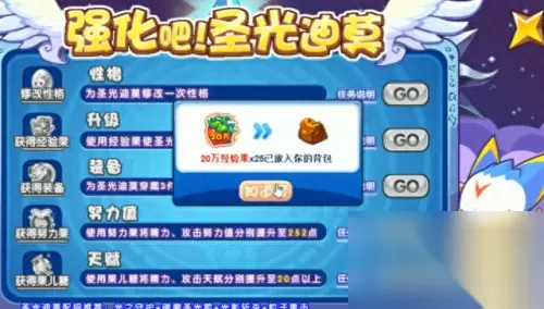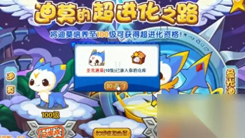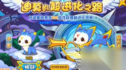 游戏中会送你一只迪莫,你需要做活动来将他超进化为圣光迪莫,活动超级简单,挑战三次小BOSS即可,BOSS等级只有几级而已,用我们的迪莫可以一招秒杀,三次就可以把迪莫超进化为圣光迪莫了。