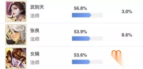近两个赛季以来,法师在场上可以发挥的空间越来越大。在KPL职业赛场上,也有不少战队是以中单作为核心来搭建体系的。 比如以武则天、张良为核心,搭配上东皇太一、白起等英雄,形成一套多控制体系。 凭借各种控制Combo,可以在前中期打出非常凶悍的Gank节奏。 比如以杨玉环、扁鹊为核心的回复流体系,搭配上一个Poke能力强的打野,比如马克波罗、公孙离。 利用团队恢复的优势,不断进行消耗拉扯,压低敌方血线后再正面开团。 现版本中单法师的梯队排行如下: T0:武则天、干将莫邪、张良 T1:杨玉环、嬴政、诸葛亮、女娲 T2:扁鹊、小乔、貂蝉、周瑜、墨子、弈星 ①张良路人局、职业赛场双榜前三 过去一周路人局排位,胜率前三的法师英雄: