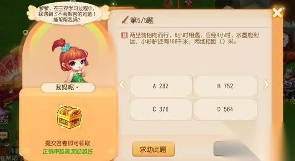 4、某帮派有24个男玩家,生死簿副本共有30位玩家通过.,则女玩家中通过生死簿的比男玩家中未通过生死簿的多()人。 答案:6 5、两坐骑相向而行,6小时相遇,后经4小时,水墨鹿到达,小彩驴还有188米,两地相距()米。 答案:564 其实这个三界谜题活动因为可以不限次数的尝试,而且奖励也不是特别好,所以随便选选也无所谓的。