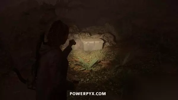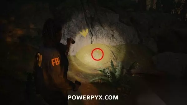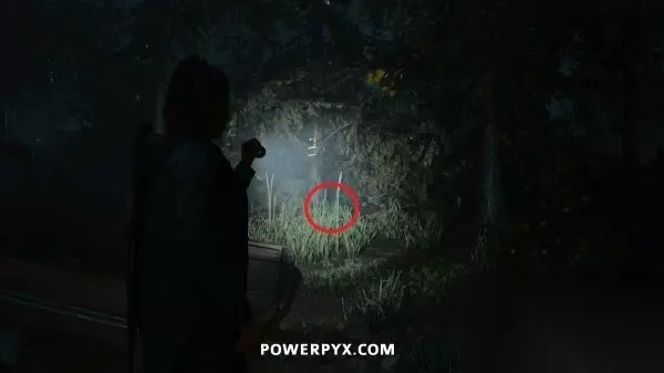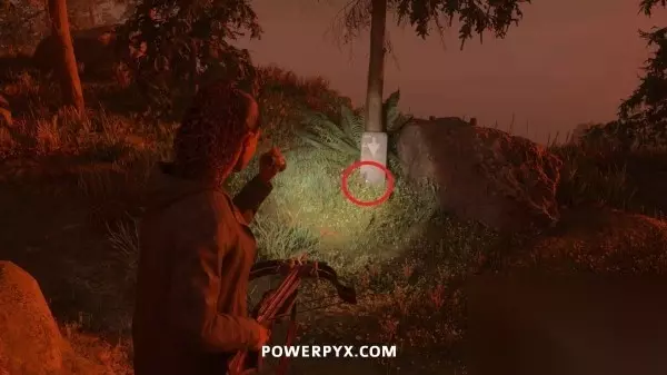 藏匿物04 从溪边沿下坡路往东南方向走,然后到达河边之前右转即可找到这个藏匿物,附近树上有黄色的发光数字(地图显示在私人小屋的正南方),密码是658。