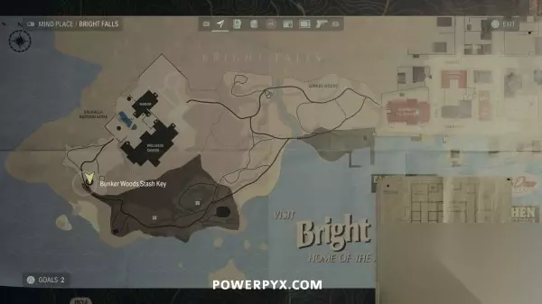 藏匿物14(地堡森林藏匿物钥匙) 击败辉落镇BOSS后洪水就会消失。从南门离开养老院,沿着小路往东走,藏匿物就在一块石头后面,石头上有个黄色箭头。需要先找到钥匙才能开启这个藏匿物,沿着带有白色箭头的灰色路标走到南边的一棵树下就能找到钥匙。
