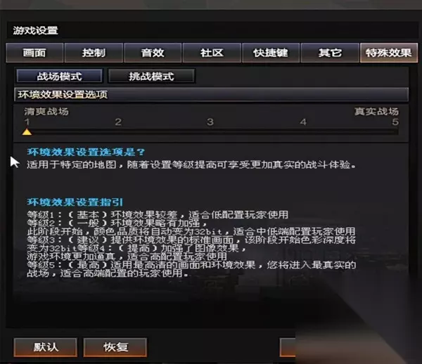 4、进入游戏设置中,点击特殊效果,把环境效果设置成1。