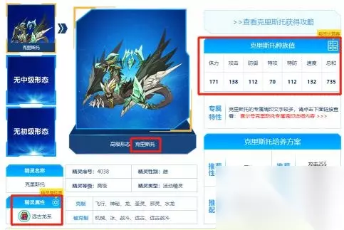 3、首先推荐玩家使用【克里斯托】去打加布,其拥有远古龙属性,可以很好的克制加布,同时自身的种族值高达735,体力、物攻和速度值都较为优秀,性格推荐选择固执,招式推荐搭配【晶魄意志 远古压迫 璀璨屏障 封魔之禁】。