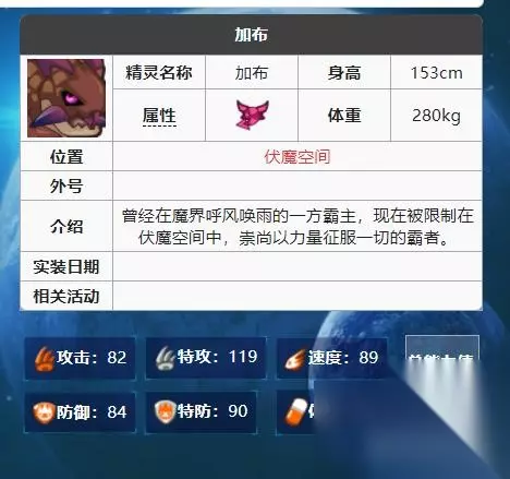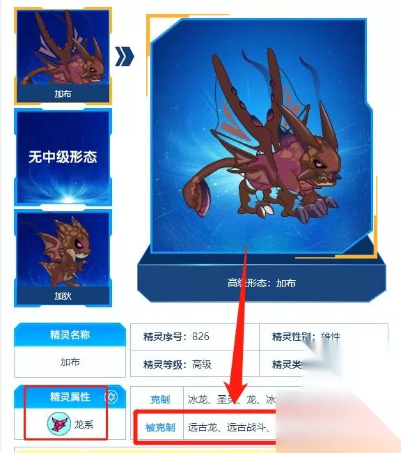 2、如下图所示,由于加布是龙系精灵,被【远古龙、远古战斗、战斗、龙、远古】所克制,根据属性克制的规则,玩家可以使用【远古龙、远古战斗、战斗、龙、远古】属性的精灵去打加布,能够起到很好的属性克制作用,打出更高的伤害。