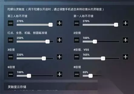 陀螺仪灵敏度 第三人称不开镜275% 第一人称不开镜270% 红点、全息、机瞄、侧面瞄准镜250% 2倍镜100% 3倍镜220% 4倍镜、VSS 165% 6倍镜100% 8倍镜65%