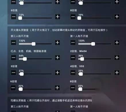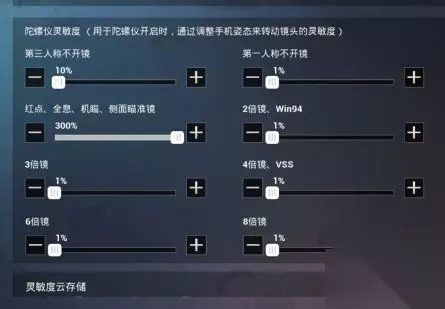 陀螺仪灵敏度 第三人称不开镜10% 第一人称不开镜1% 红点、全息、机瞄、侧面瞄准镜300% 2倍镜1% 3倍镜1% 4倍镜、VSS1% 6倍镜1% 8倍镜1%
