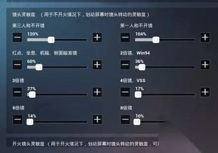 开火镜头灵敏度 第三人称不开镜133% 第一人称不开镜104% 红点、全息、机瞄、侧面瞄准镜60% 2倍镜36% 3倍镜27% 4倍镜、VSS17% 6倍镜14% 8倍镜12%