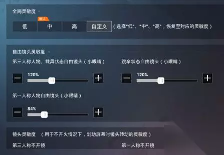 3.适用范围 (手机用户、二指玩家) 自由镜头灵敏度 第三人称人物、载具状态自由镜头(小眼睛)120% 跳伞状态自由镜头(小眼睛)120% 第一人称人物自由镜头(小眼睛)84%