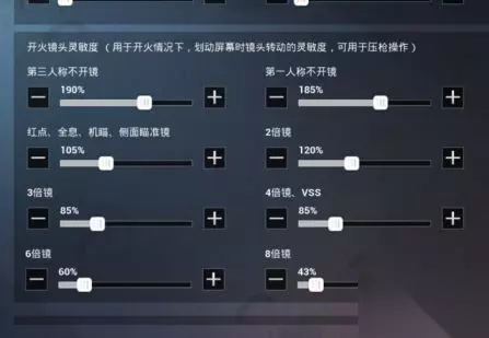 开火镜头灵敏度 第三人称不开镜190% 第一人称不开镜185% 红点、全息、机瞄、侧面瞄准镜105% 2倍镜120% 3倍镜85% 4倍镜、VSS 85% 6倍镜60% 8倍镜43%