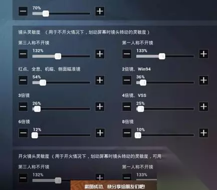 开火镜头灵敏度 第三人称不开镜132% 第一人称不开镜133% 红点、全息、机瞄、侧面瞄准镜54% 2倍镜36% 3倍镜27% 4倍镜、VSS 25% 6倍镜22% 8倍镜22%