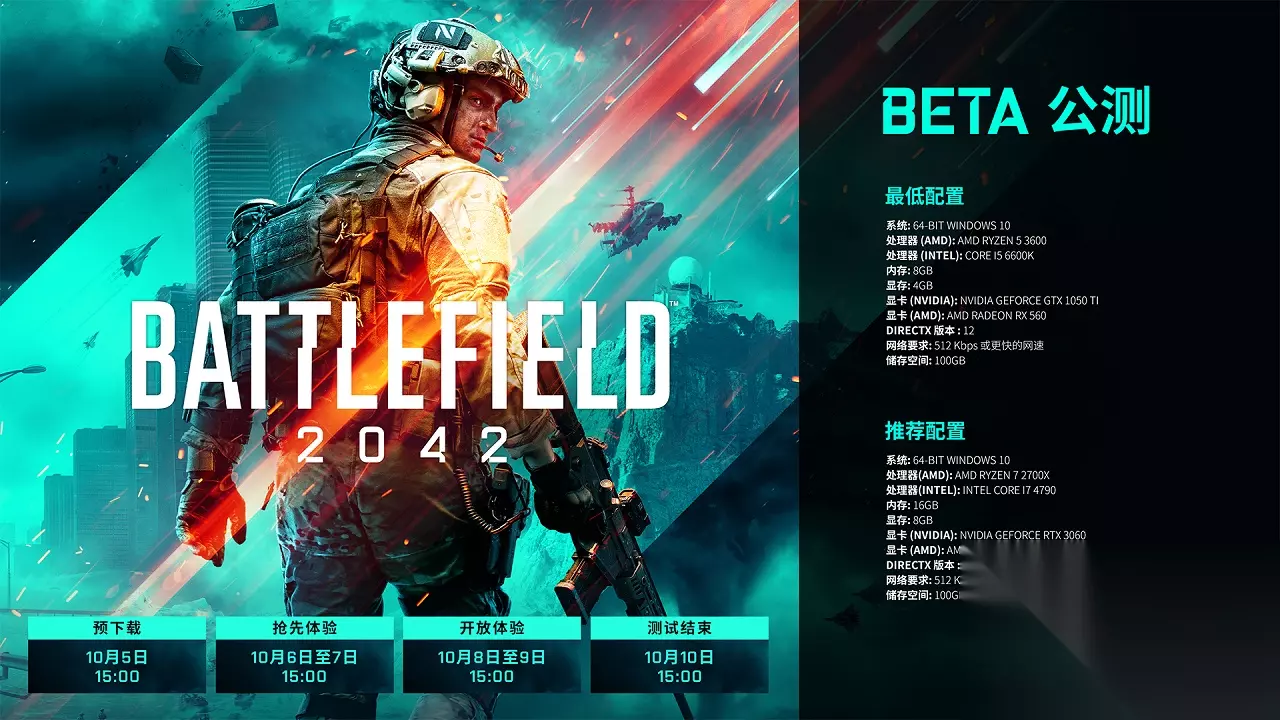 战地2042配置要求高吗?最近战地公布了最新b测预告片,同时公布了最新的b测时间,参与预购的玩家或是 EA Play 会员可以在 10 月 6-7 日抢先体验游戏,其余玩家可在 8-9 日进行测试,下面一起来看一下战地2042配置要求。 战地2042配置要求 根据官方公布的配置要求,《战地 2042》最低需要英特尔酷睿 i5 6600K 与 GTX 1050Ti,以及 8GB 内存,AMD 配置最低要求 R5 3600 + RX 560。 最低配置: 操作系统: 64-bit Windows 10处理器(AMD):R5 3600 处理器(英特尔): Core i5 6600K 内存: 8GB 显存: 4GB 显卡(AMD):Radeon RX 560 显卡(英伟达):GeForce GTX 1050 Ti DirectX 版本: 12 推荐配置: 操作系统: 64-bit Windows 10 处理器(AMD):Ryzen 7 2700X 处理器(英特尔):Core i7 4790 内存: 16GB 显存: 8GB 显卡(AMD):Radeon RX 6600 XT 显卡(英伟达): GeForce RTX 3060 DirectX 版本: 12