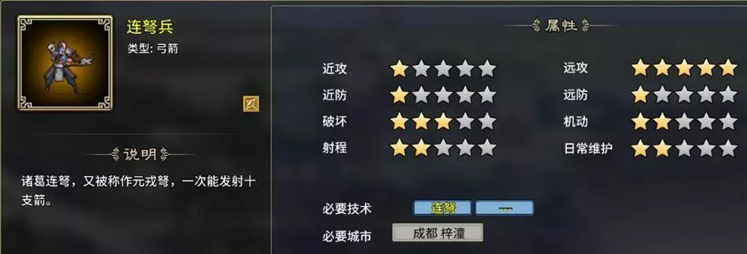 一、弓兵系: 1、连弩兵:专业射手,究极单体伤害,终极手短,不能用火箭,需要连弩支持,成都、梓潼特性开启,4个虎符。