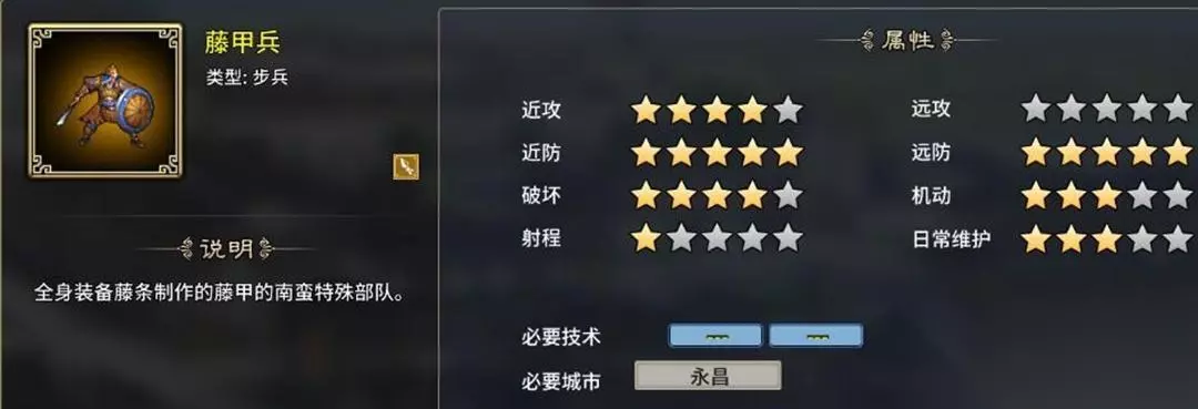 3、藤甲兵:刀枪不入,就是怕火,超强双防,不仅肉,伤害还高,受到3倍火焰伤害告辞,永昌特性开启,只有2个虎符。