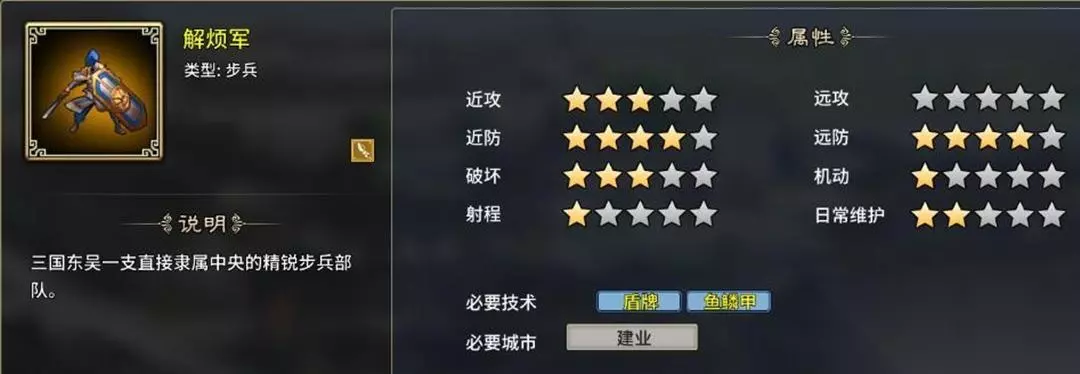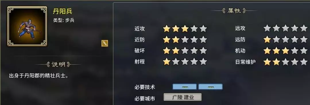 三、步兵系: 1、丹阳兵:东吴地区可代替轻步兵使用的高级版轻步兵,不怕降士气,有4个虎符,缺点是防御先天不足,需要广陵跟建业开启特性。